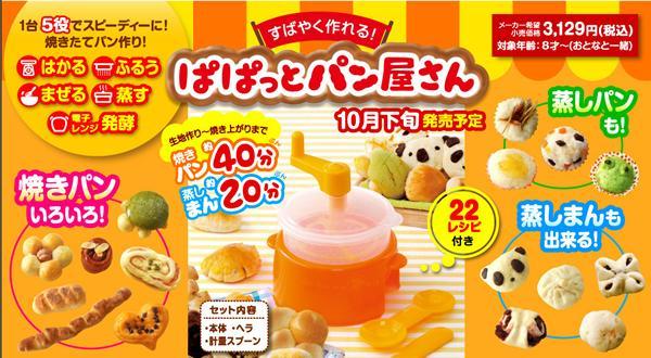 【楽天最安値に挑戦】手軽に素早くパンが作れる!ぱぱっとパン屋さん 【タカラトミー】 価格: 2,100円 レビュー評価: 0.0 レビュー数:0 商品名 ぱぱっとパン屋さん 商品説明 ふた付きの円筒形のボウル上部に回転式ハンドルが付いた形でグルグルとレバーを回して生地を簡単に作ることができます。生地作りから焼き上げまでたったの40分で出来上がり!「はかる」「ふるう」「蒸す」「まぜる」「電子レンジ発酵」の1台5役!焼きパン、蒸しパン、蒸しまんも親子で一緒に楽しく作れます。楽しい22レシピが付属。 セット内容 本体、ヘラ、軽量スプーン パッケージサイズ 約205×210×170mm JAN 4904810347491 メーカー タカラトミー Supported by 楽天ウェブサービス |